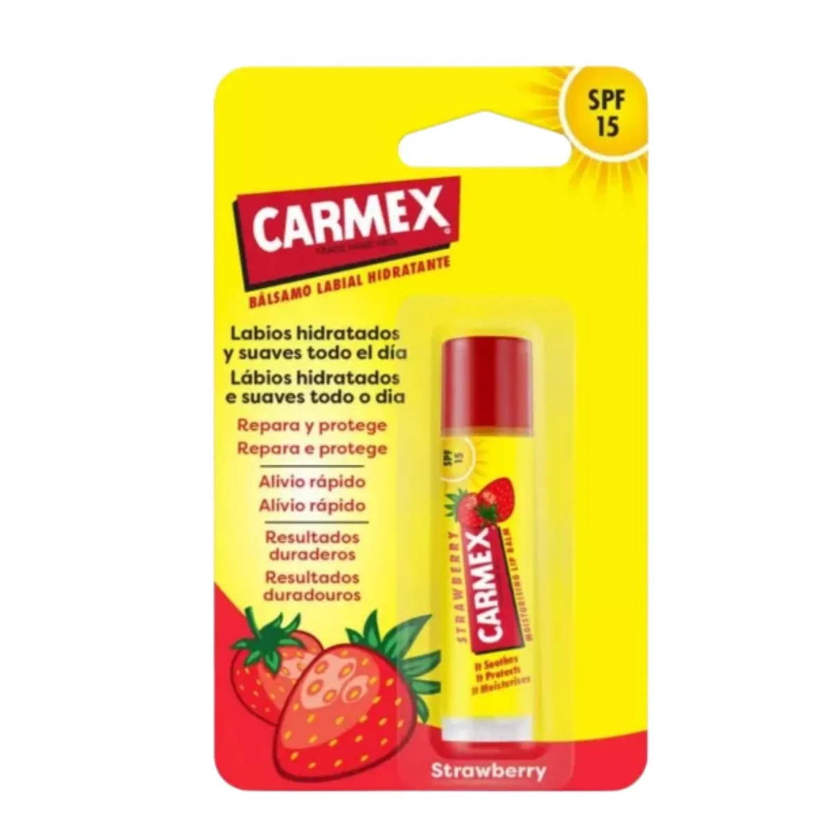 Carmex Stick Hidratante Labial Spf15 Morango 4,25G, é a solução ideal para lábios secos e gretados, proporcionando hidratação intensa, reparação e proteção diária.
