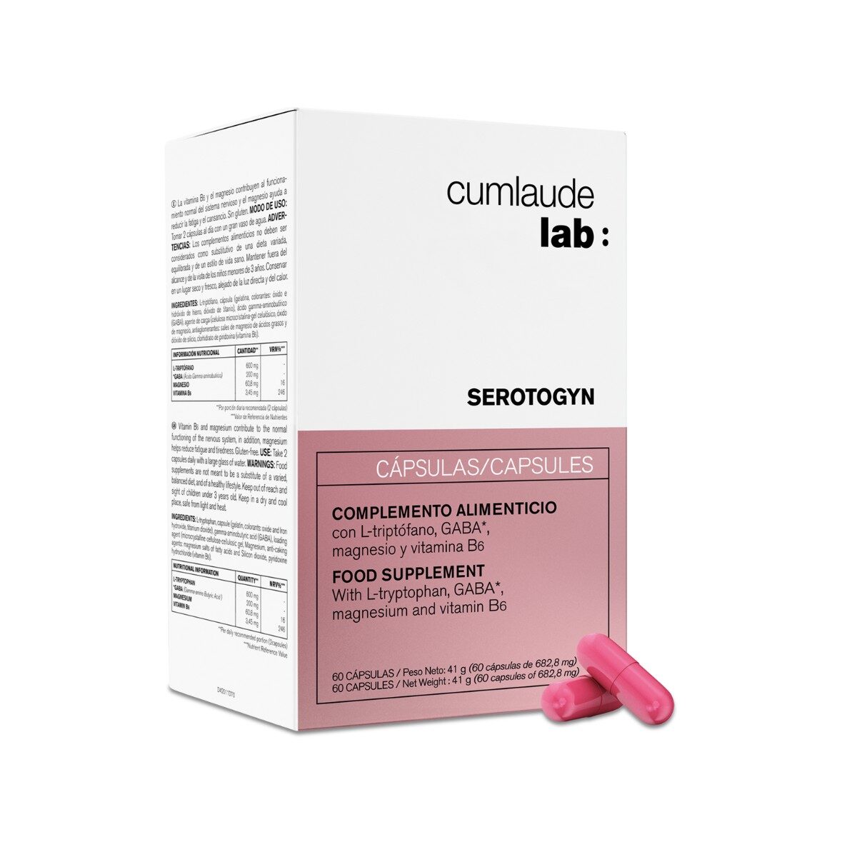 Cumlaude Lab Serotogyn , suplemento alimentar com L-triptofano, GABA, magnésio e vitamina B6, indicado para o período perimenopáusico, menopáusico e pós-menopáusico. A vitamina B6 e o magnésio contribuem para o funcionamento normal do sistema nervoso, enquanto o magnésio ajuda a reduzir a fadiga e o cansaço. Produto sem glúten e sem lactose, com uma toma simples: 2 cápsulas por dia, com um copo grande de água.